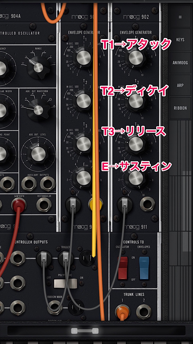 鍵盤を離すとRELEASEタイムで音が減衰して鳴り止みます。ピアノのように、鍵盤を押したらATTACKで最大音量に達した後、