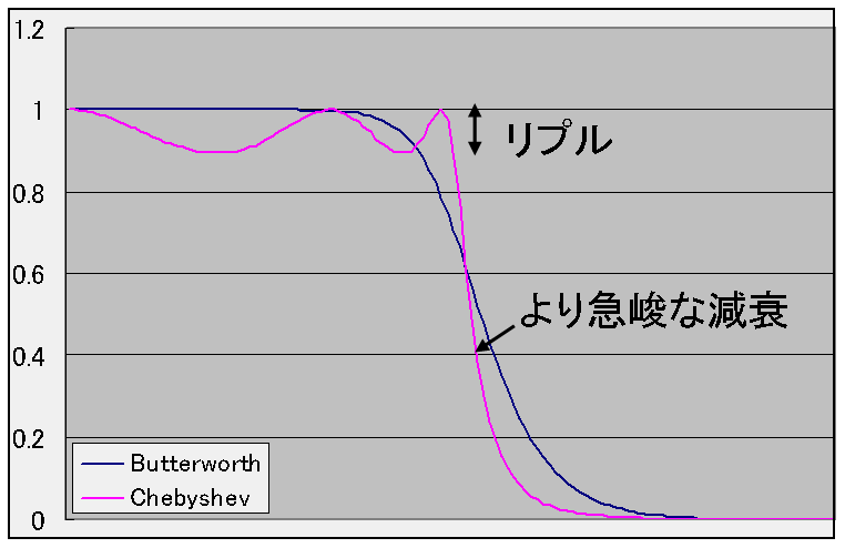概要チェビシェフフィルタ(Chebyshev filter)は、通過域で等リプルとなるようなローパスフィルタです。リプルを許容することで急峻なカットオフ特性を得ることができます。 リプルの許容…