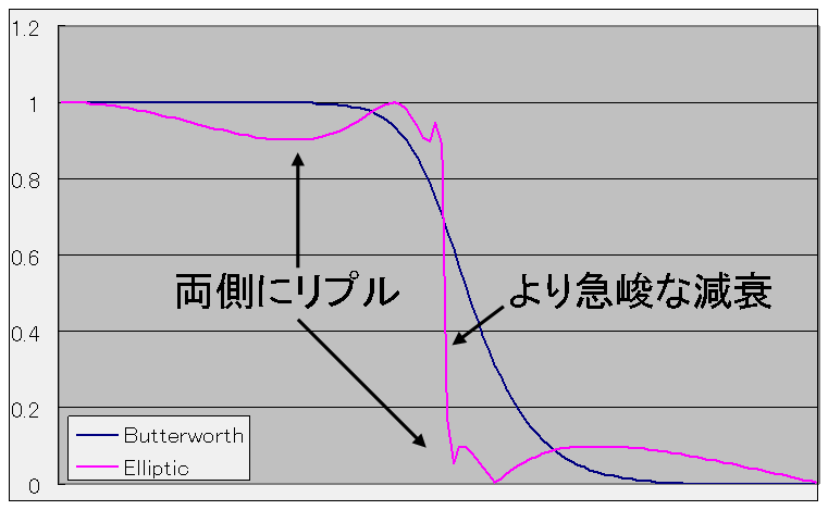 概要「チェビシェフフィルタ」や「逆チェビシェフフィルタ」は、通過域または阻止域のどちらか一方で等リプルとなるようすることで、「バターワースフィルタ」よりも急峻なカットオフ特性を得ていました。それに対して、…
