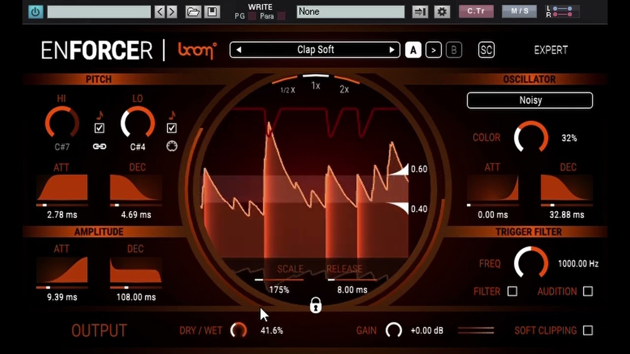 - Detector & Thresholds:Upper/Lower Thresholdで狙ったトランジェントのみを検出。Filter & Auditionで周波数帯を絞り、不要なスネアやエコーの誤反応を防げる。