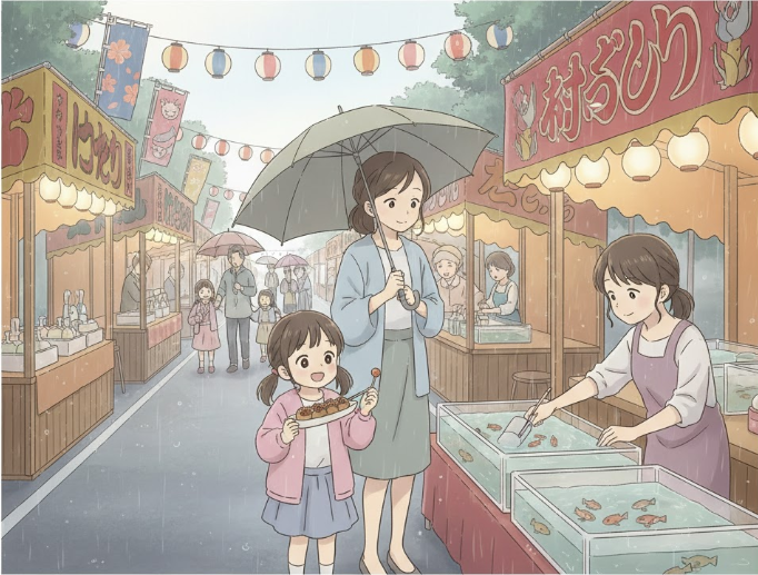 また、他の自治会のお祭りにも足を運びました。あいにく途中で雨に降られてしまいましたが、家内も娘も楽しそうに過ごしていて、いい時間になりました。夏の名残のような空気の中で、地域の人たちの笑顔が印象的でした。